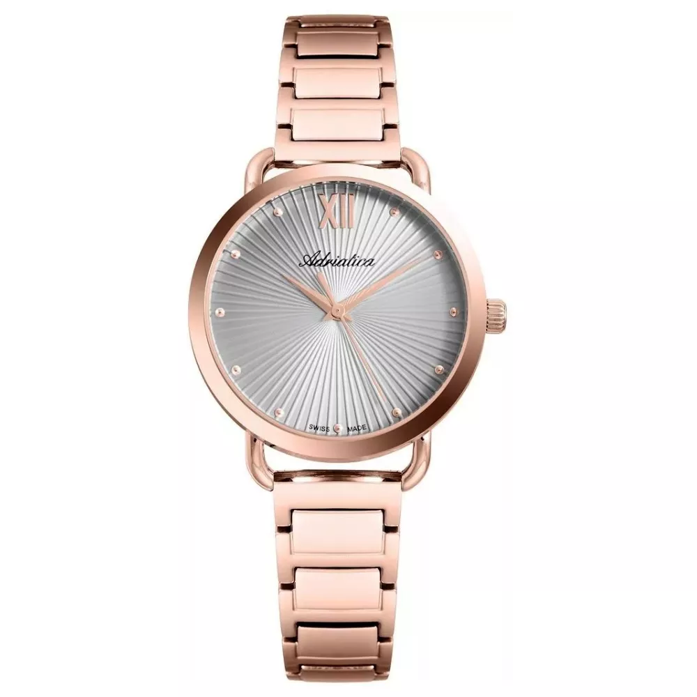 Moderan ženski ručni sat brenda Adriatica iz kolekcije Essence. Izrađen je od nerđajućeg čelika u boji roze zlata. Postavljen je na čeličnoj narukvici koja se idealno uklapa sa brojčanikom sive boje. Sveden dizajn čini ga idealnim aksesoarom uz svaku odevnu kombinaciju.