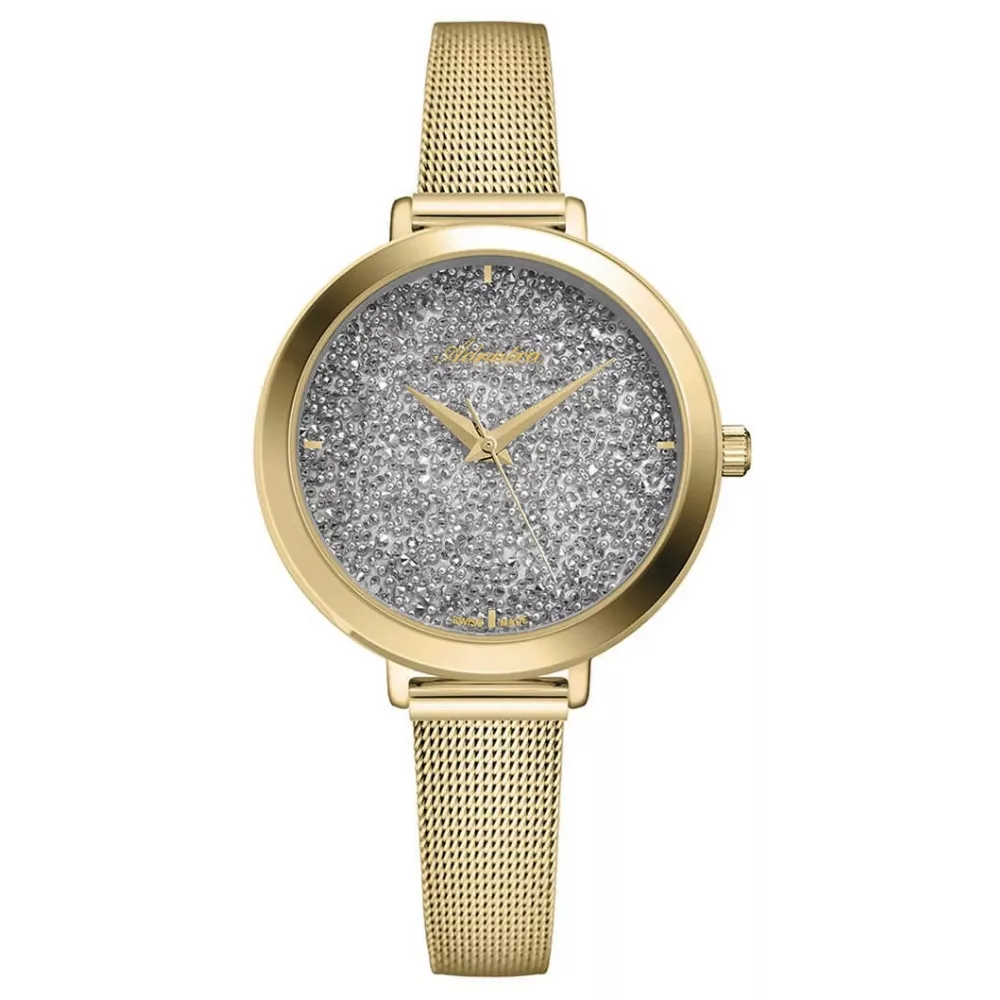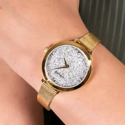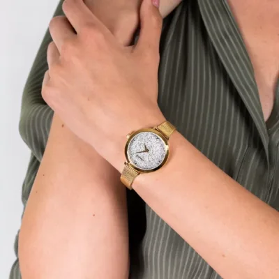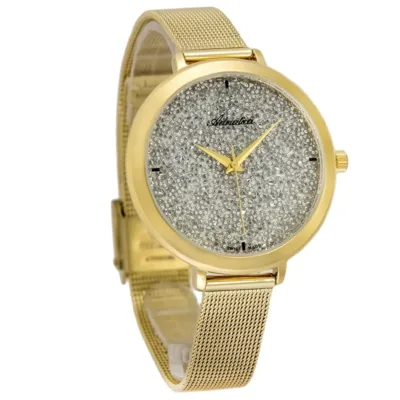 Moderan ženski sat brenda Adriatica odlikuje atraktivan dizajn. Svedene, čiste linije u kombinaciji sa brojčanikom ukrašenim Swarovski kristalima ističu kućište u boji zlata na koje se nadovezuje mrežasta narukvica. Zbog svoje upečatljivosti lako se kombinuju uz svaki odevni stil.