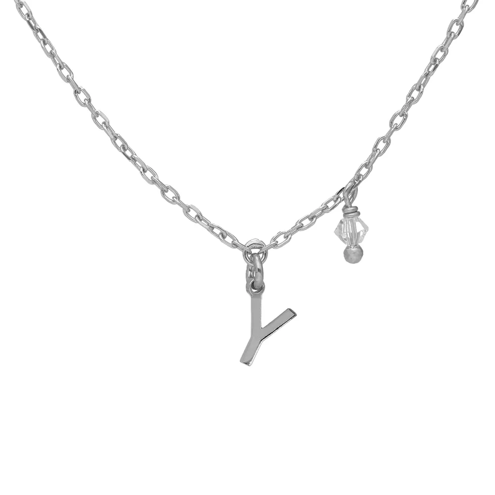 Victoria Cruz ženska srebrna ogrlica koja uključuje inicijal (slovo Y) i proziran kristal povezane putem lanca sa povezanim karikama.