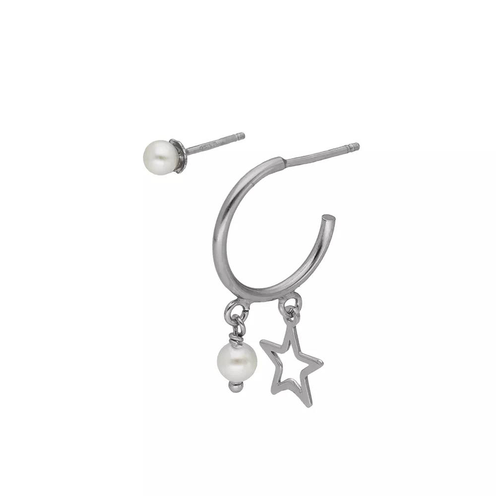 Victoria Cruz par ženskih srebrnih minđuša, jedna u obliku otvorenog obruča sa privescima u obliku kristala u boji bisera i zvezdica i druga beli biser.