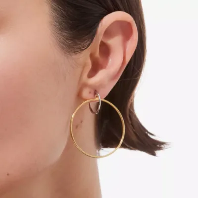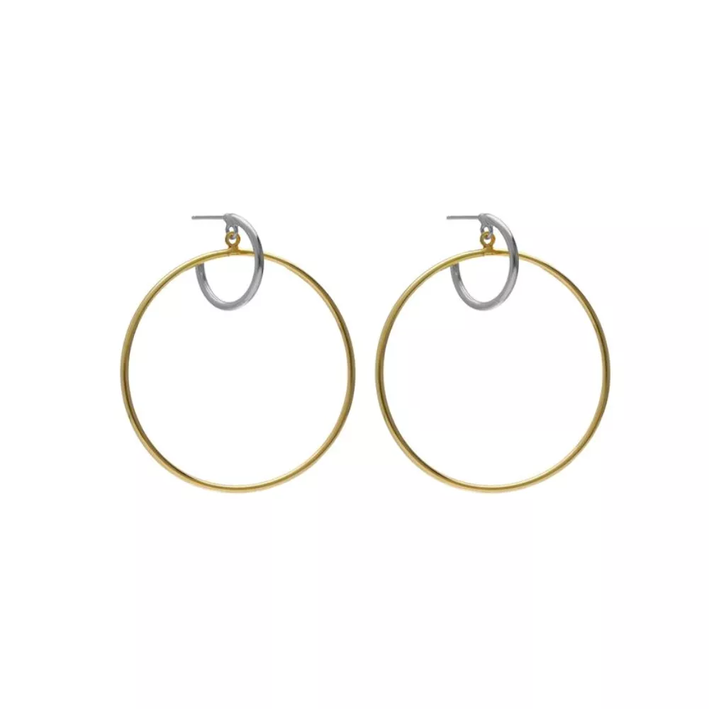 Elegante ženske minđuše iz Frame kolekcije brenda Victoria Cruz, dizajnirane sa dva isprepletana obruča – manjim od rodijumom presvučenog srebra i većim obručem presvučenim zlatom. Zatvaranje na puzet kopču pruža sigurnost i udobnost pri nošenju.