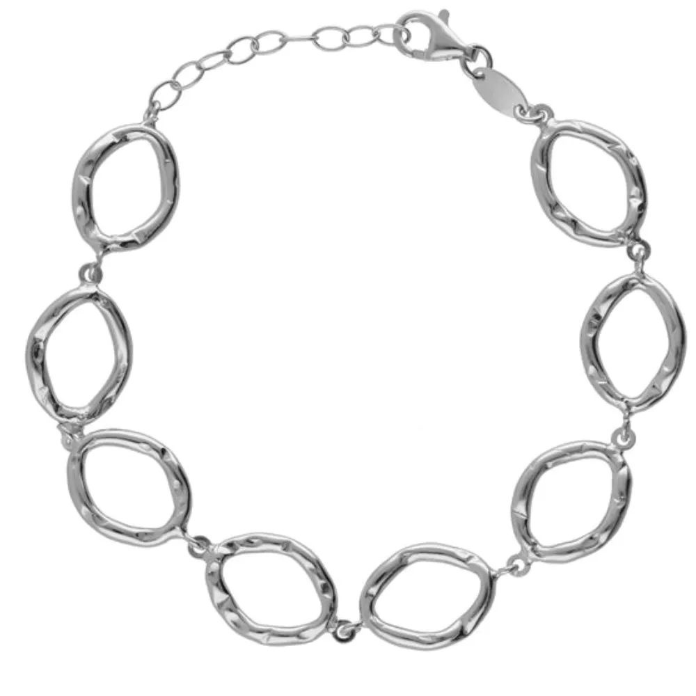 Ova ženska narukvica brenda Victoria Cruz izrađena je od srebra, a njen dizajn karakterišu elipsasti segmenti sa sjajnom završnom obradom. Dužina narukvice je 16,5 cm, uz dodatnu produžnu lančicu od 3 cm, što omogućava prilagođavanje veličine.