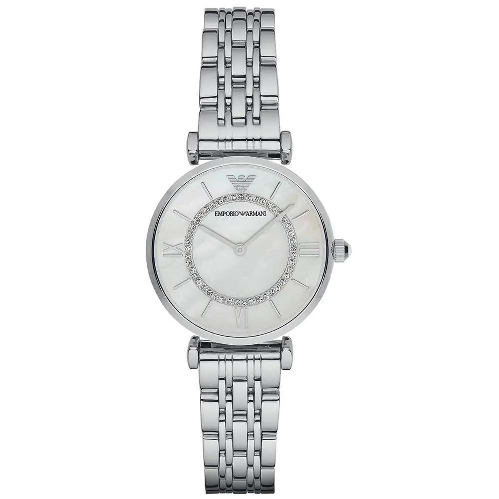 Elegantn ženski sat brenda Armani sa sedefastim brojčanikom i istaknutim rimskim brojevima.