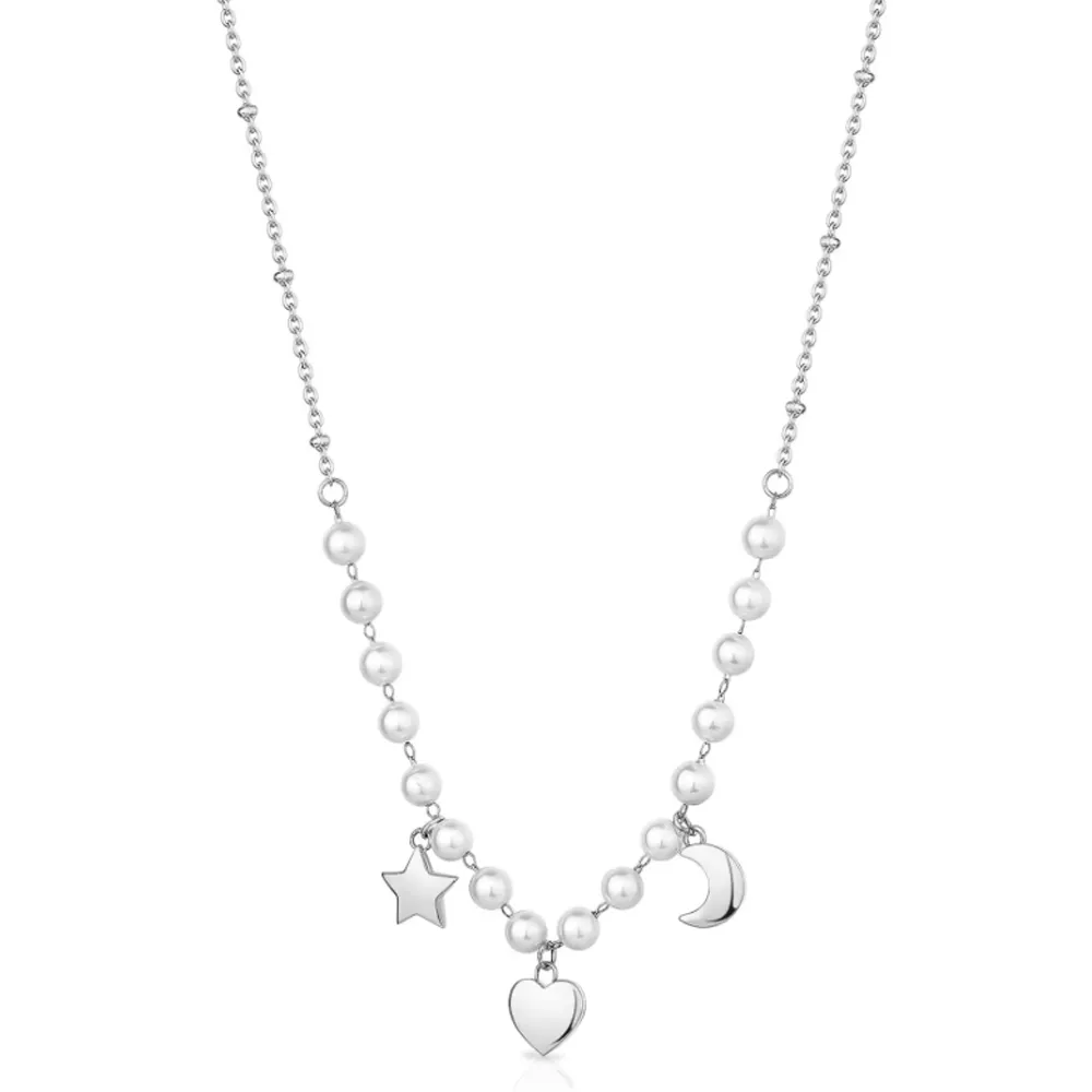 Ogrlica BAH79 CHANT od nerđajućeg čelika u boji srebra sa perlicama – biseri i tri viseća priveska: zvezda, srce, polumesec.
