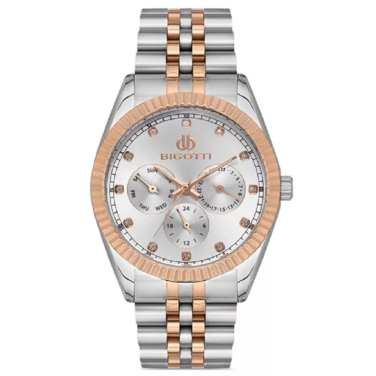 Ženski ručni sat italijanskog brenda Bigotti. Jednostavnog je dizajna, u kombinaciji boja roze zlata i srebra. Brojčanik je u srebrnoj boji sa tri podbrojčanika različitih funkcija.
