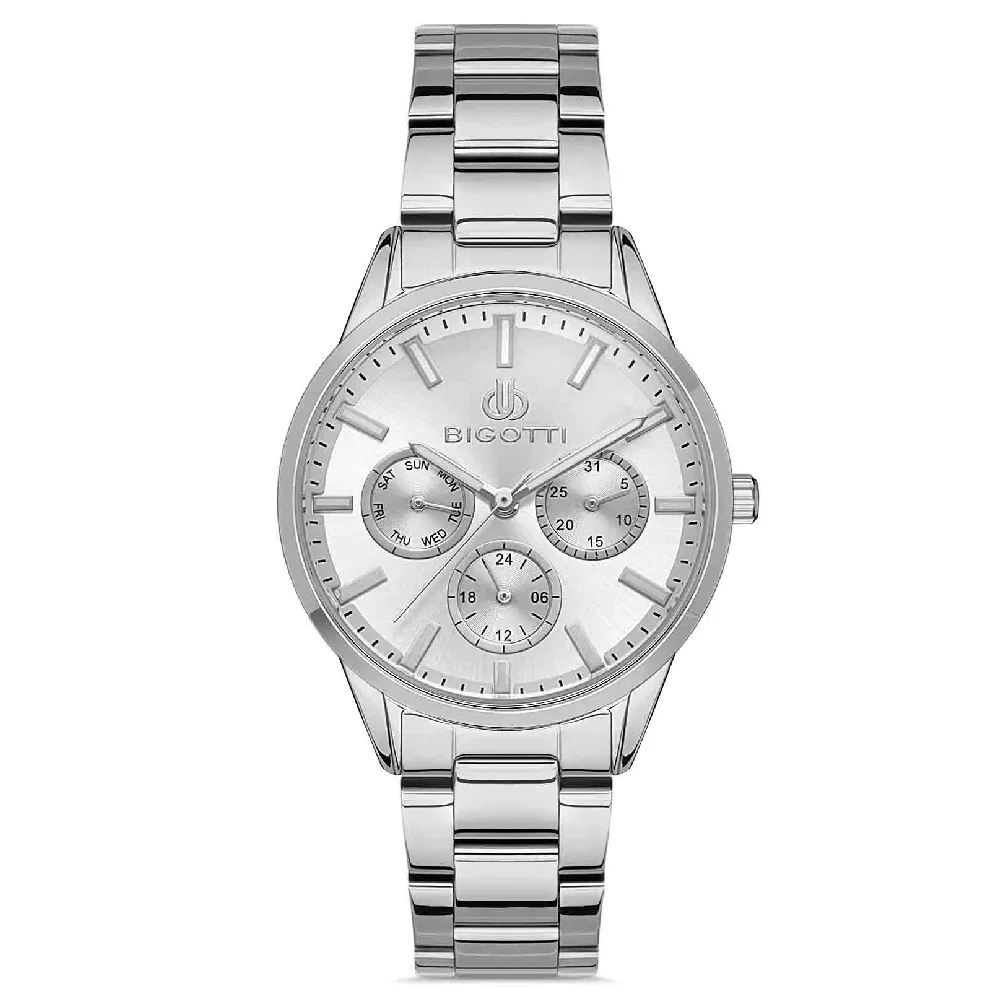 Ženski ručni sat italijanskog brenda Bigotti. Jednostavnog je dizajna, u boji srebra. Brojčanik je u srebrnoj boji sa tri podbrojčanika različitih funkcija.