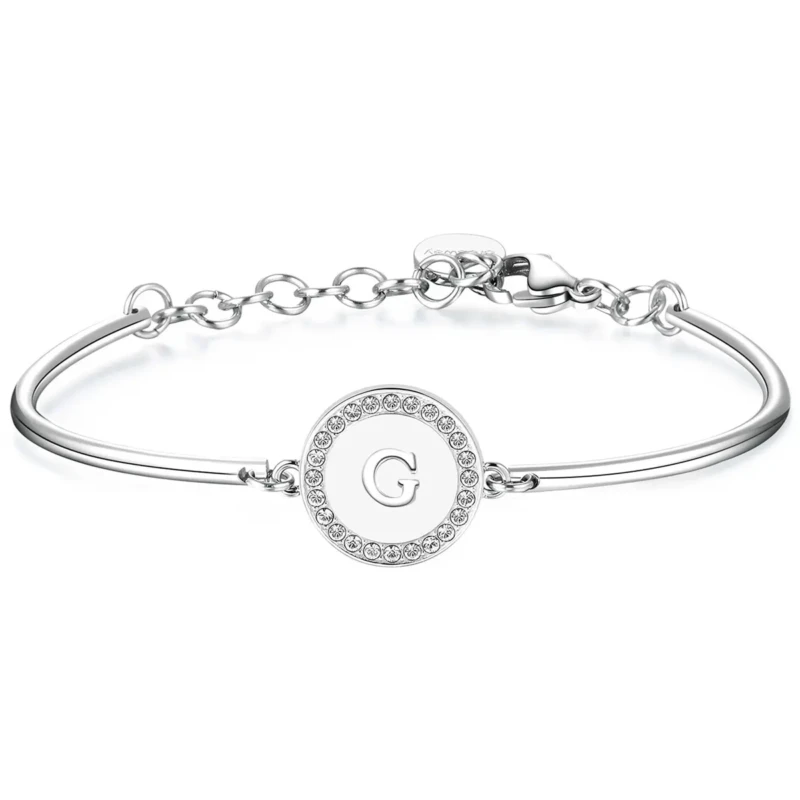 Moderna ženska narukvica brenda Brosway, iz kolekcije Chakra. Karakteriše je čvrsta forma, kao i privezak u kombinaciji sa Swarovski kristalima i ugraviranim slovom G.