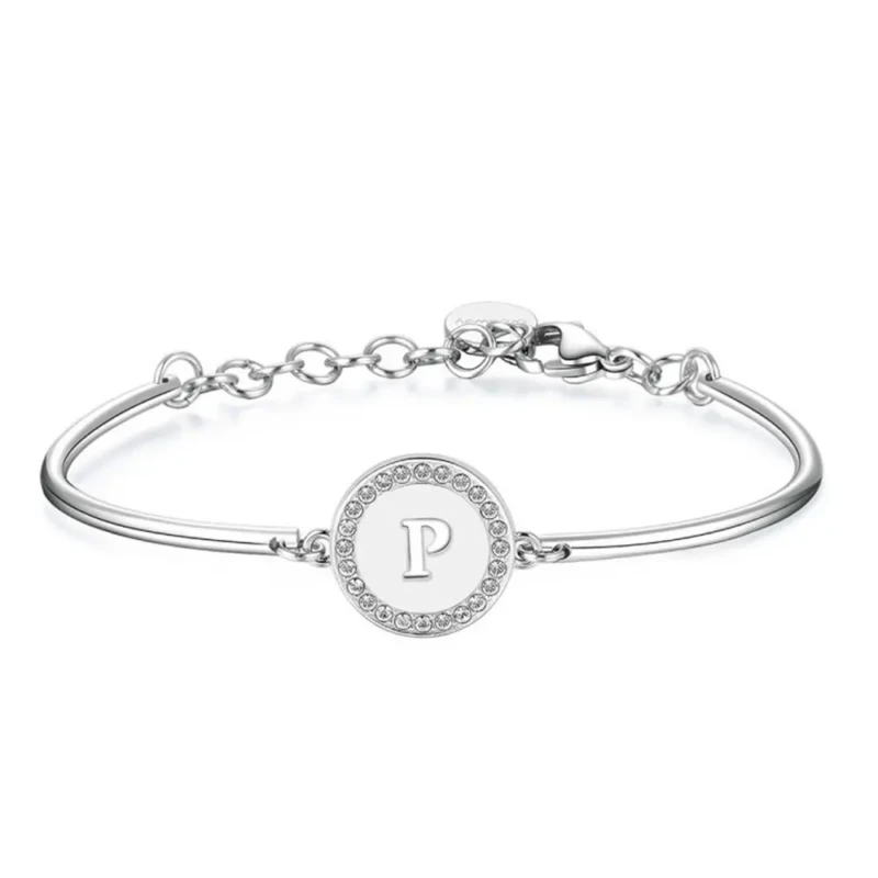 Moderna ženska narukvica brenda Brosway, iz kolekcije Chakra. Karakteriše je čvrsta forma, kao i privezak u kombinaciji sa Swarovski kristalima i ugraviranim slovom P.