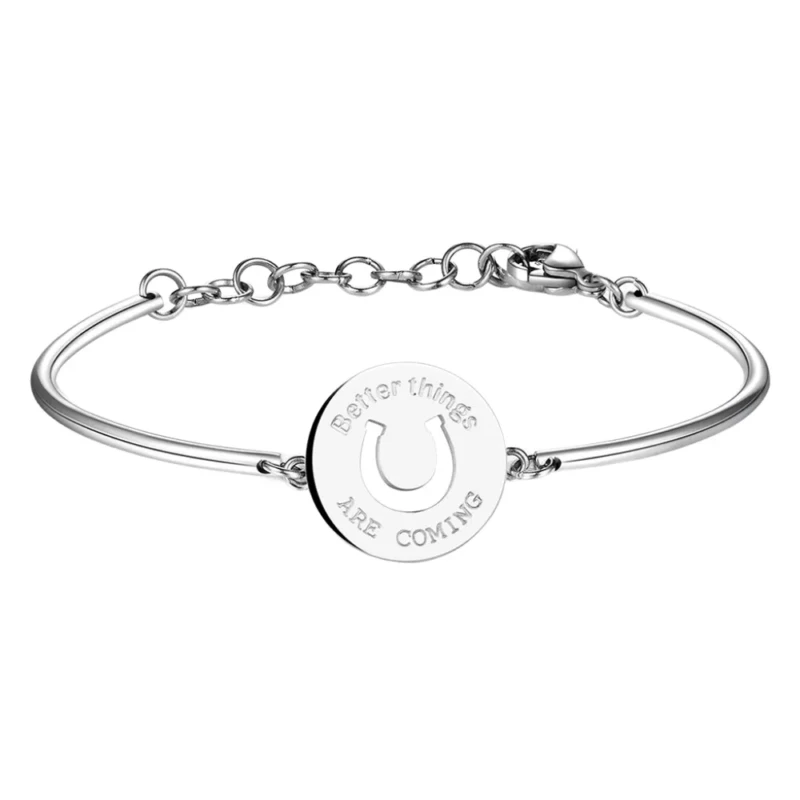 Moderna ženska narukvica brenda Brosway, iz kolekcije Chakra. Karakteriše je čvrsta forma, kao i privezak sa znakom potkovice.