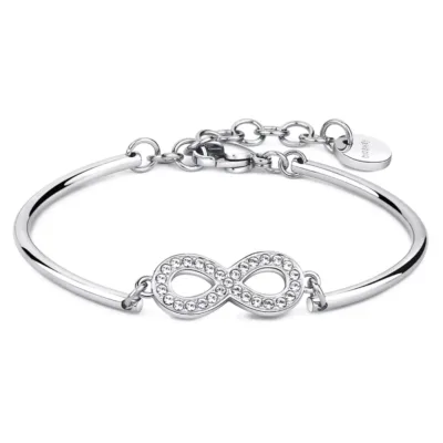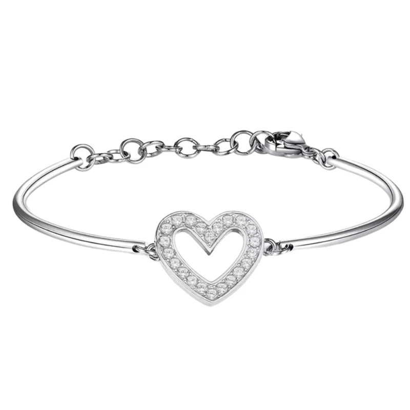 Moderna ženska narukvica brenda Brosway, iz kolekcije Chakra. Karakteriše je čvrsta forma, kao i privezak u obliku srca u kombinaciji sa Swarovski kristalima. Izrađena je od najkvalitetnijeg čelika 316L u boji srebra što je čini pogodnom za svakodnevno nošenje.