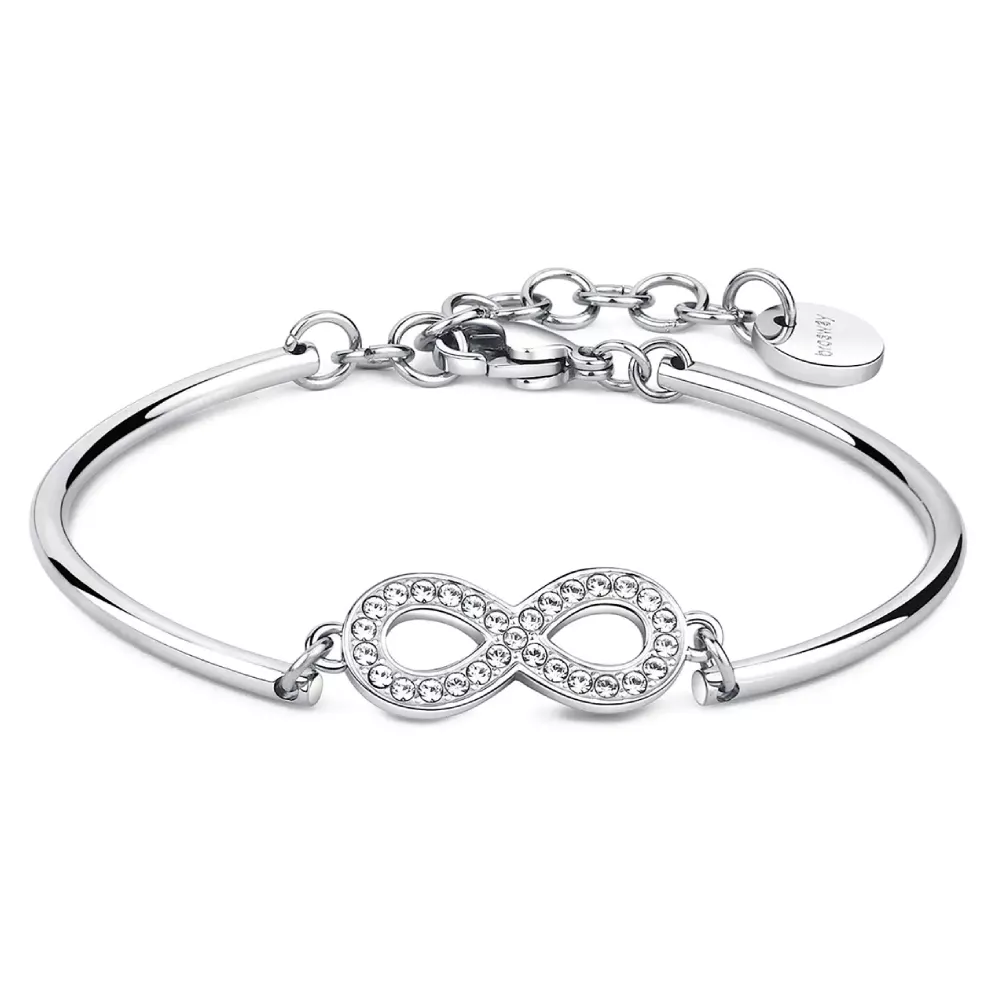Moderna ženska narukvica brenda Brosway, iz kolekcije Chakra. Karakteriše je čvrsta forma u boji srebra, kao i privezak sa simbolom beskonačnosti koji predstavlja stimulus da vaš um traži odgovore i istražuje nepoznate uglove stvarnosti. Kao simbol večnosti izražava čvrstu nameru da posvetite svoj život nečemu ili nekome drugom.