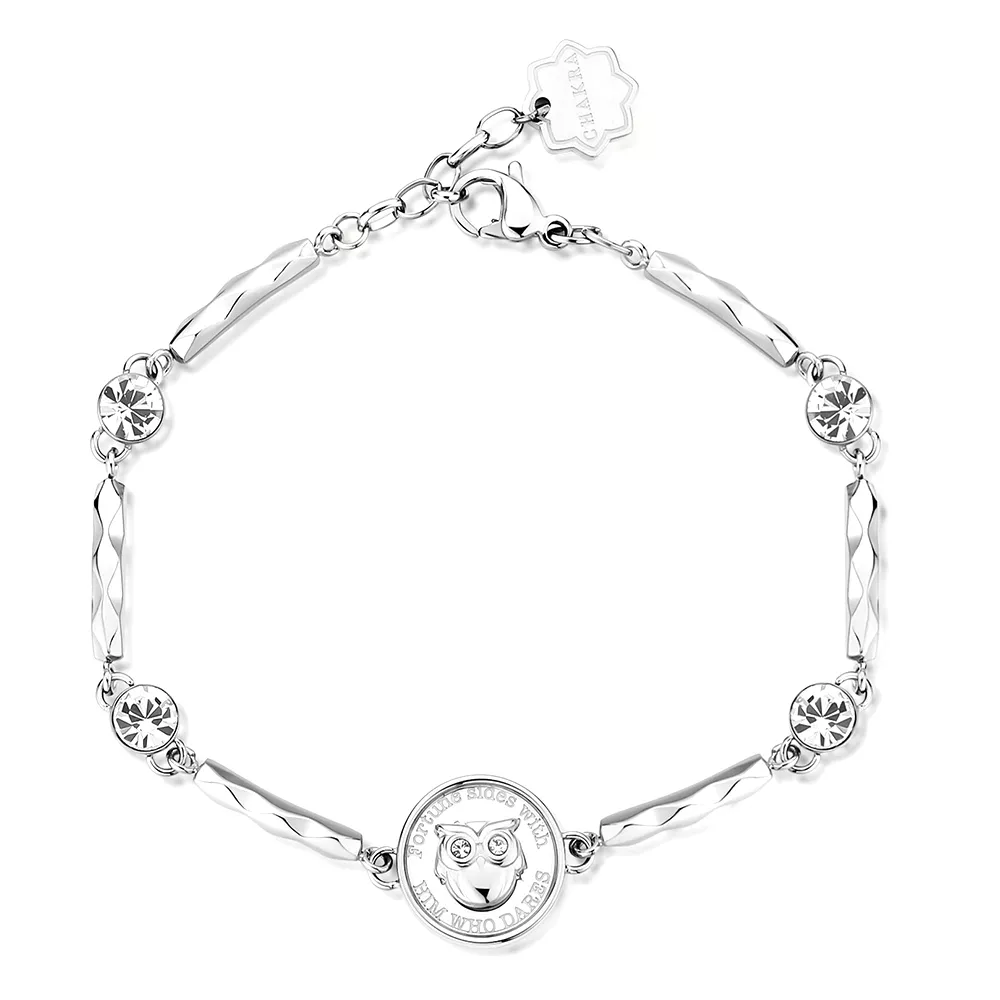 Brosway ženska narukvica iz kolekcije Chakra. Narukvica je izrađena od kvalitetnog nerđajućeg čelika ukrašenom kristalima, sa motivom sove na privesku.