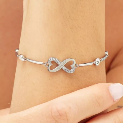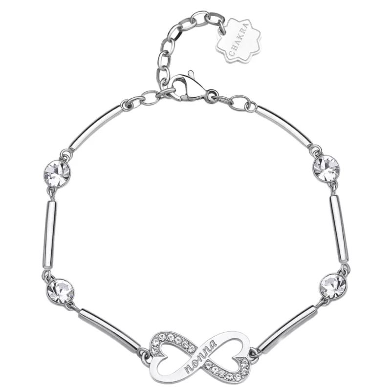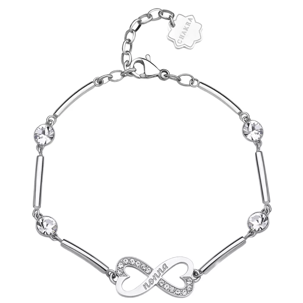RAZUMEVANJE, STRPLJENJE, LJUBAV Narukvica od polukrutog nerđajućeg čelika 316L sa pločicom u obliku znaka beskonačnosti, ukrašena natpisima i prozirnim kristalima.