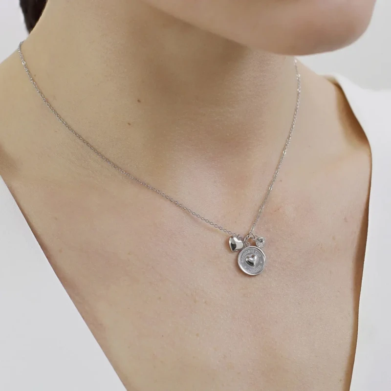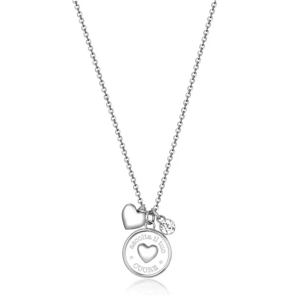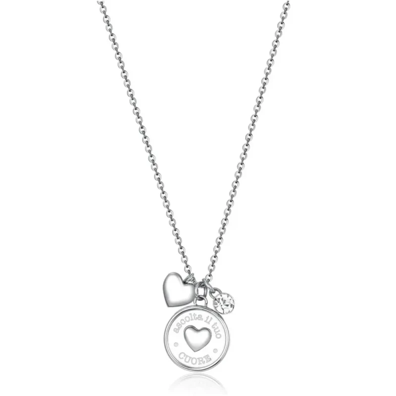 Ženska ogrlica brenda Brosway iz kolekcije Chakra. Izrađena je od hirurškog čelika 316L sa privescima u obliku srca i kristalom koji daje notu elegancije ovom modelu i čini ga pogodnim za svakodnevno nošenje.
