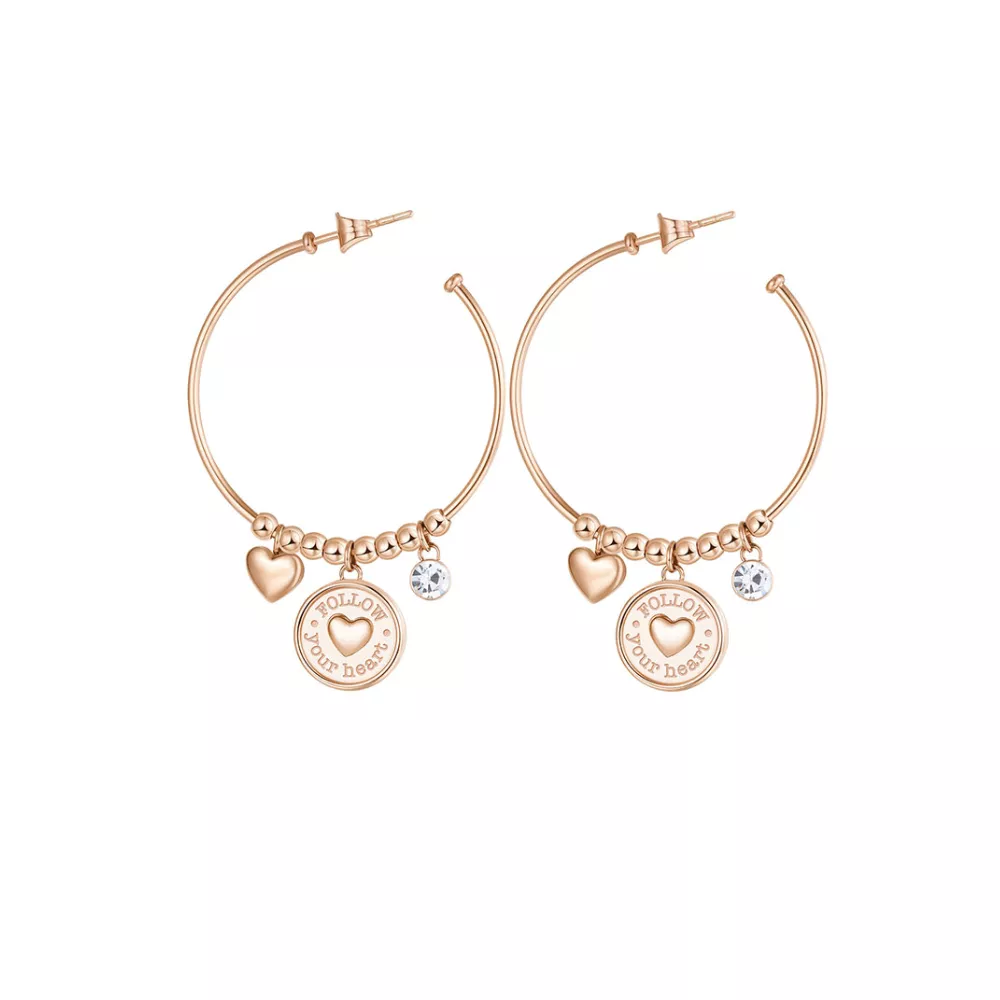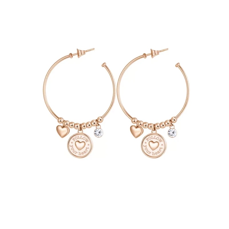 Ženske minđuše, alke CHAKRA SRCE od nerđajućeg čelika prečnika 5cm u boji roze zlata sa visećim privescima: srce, krug sa porukom: FOLLOW YOUR HEART / SLUšAJ SVOJE SRCE i cirkon.
