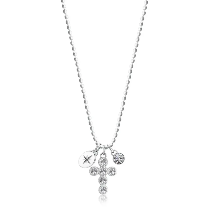 Ženska ogrlica od nerđajućeg čelika 316L boje srebra, sa priveskom u obliku krsta i kristalima. Krst je geometrijska figura koja unosi red u haos. To je drevni simbol koji daje slobodu, spasenje i spokoj.