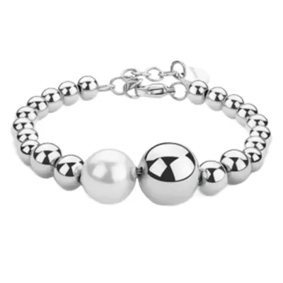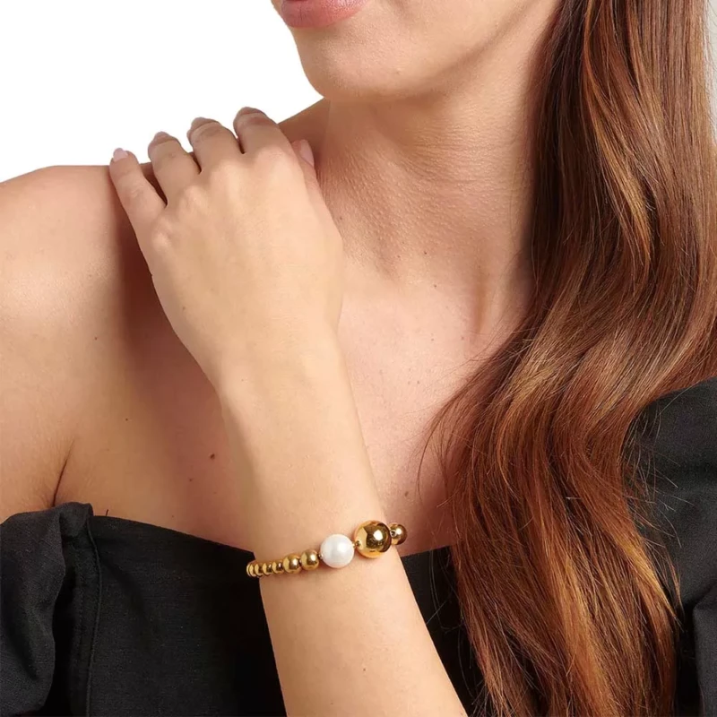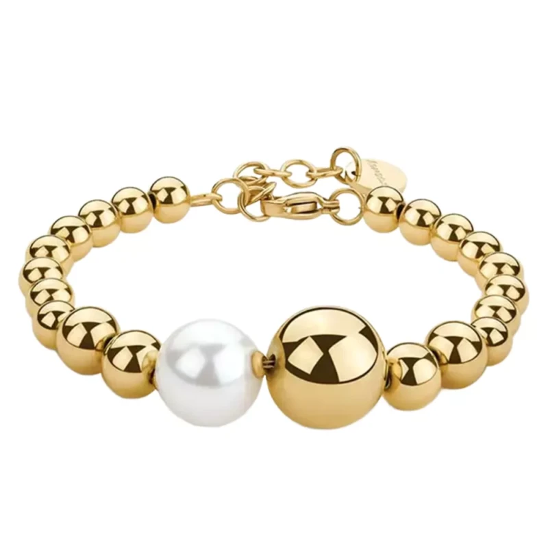 Brosway Perfect ženska narukvica sa biserom i kuglicama od nerđajućeg čelika u boji žutog zlata.