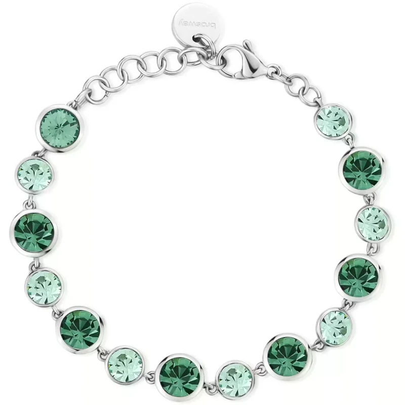 Brosway ženska narukvica od nerđajućeg čelika u boji srebra sa kristalima u nijansama zelene boje.