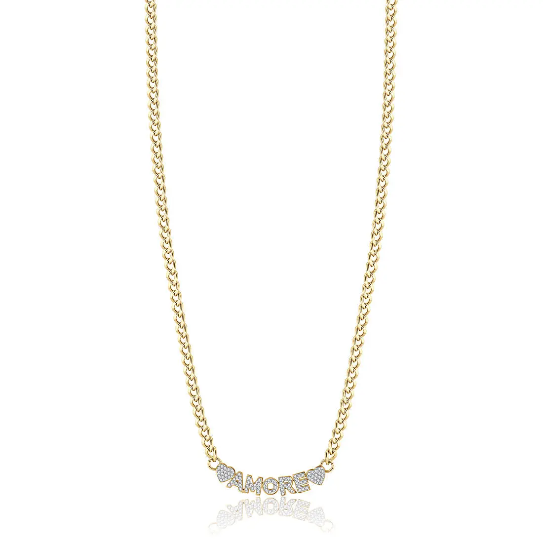 Ženska ogrlica brenda Luca Barra izrađena od hirurškog čelika, u boji žutog zlata. Karakteriše je moderan dizajn, sa atraktivnim natpisom ljubav. Dužina ogrlice je 38+5cm.