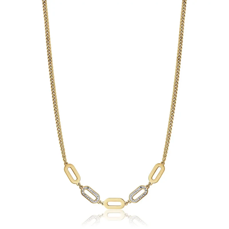 Ženska ogrlica brenda Luca Barra. Izrađena je od hiruškog čelika u boji žutog zlata sa interesantnim detaljima koji čine ovaj model atraktivnim i pogodnim za svakodnevno nošenje. Dužina ogrlice 40+5cm.
