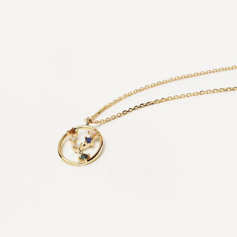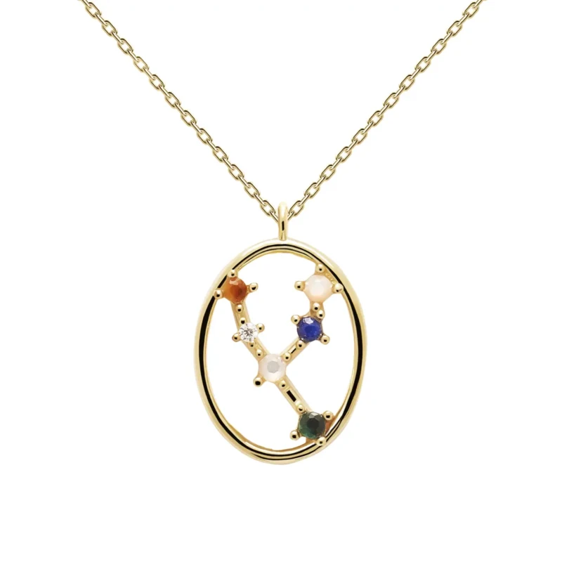 Ženska ogrlica sa pozlatom i priveskom sazvežđa horoskopskog znaka Bik. Prvezak je sa detaljima od poludragog kamenja: malahit, tigrovo oko, ružičasti kvarc.