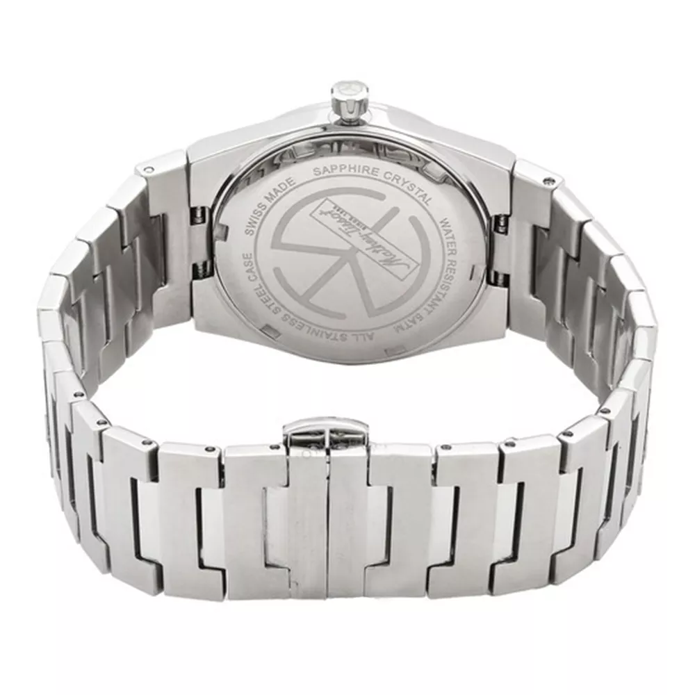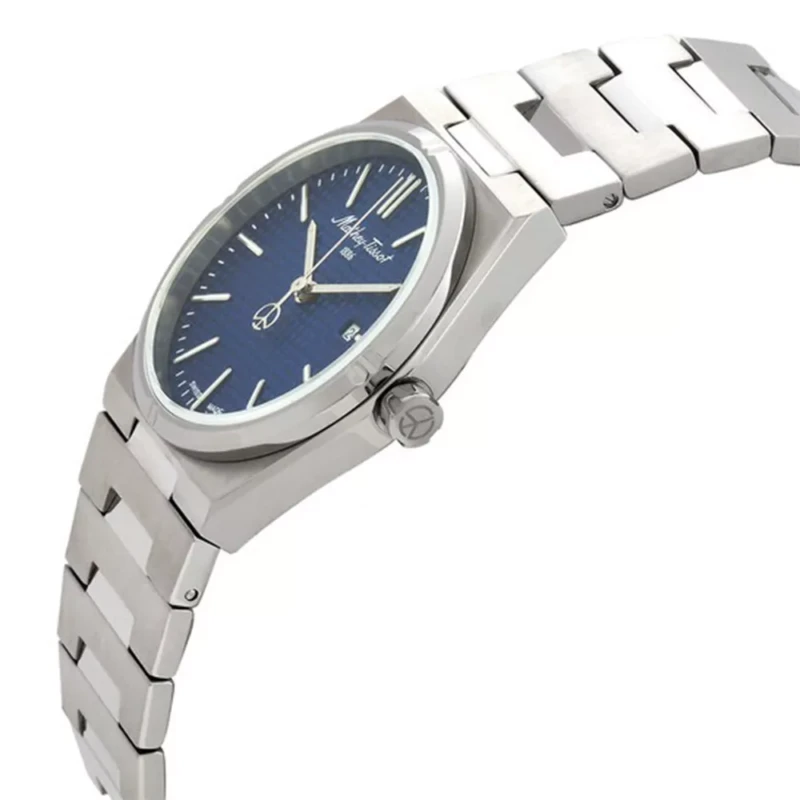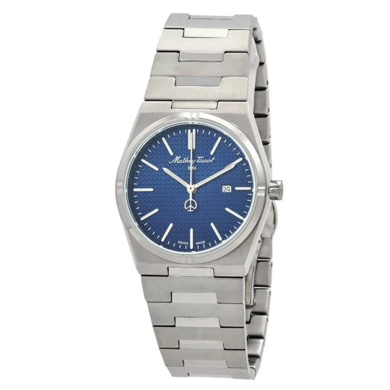 Mathey Tissot ženski sat iz kolekcije Zoltan. Kuc´ište i narukvica od nerđajućeg čelika u srebrnoj boji, sa fiksnim prstenom od nerđajućeg čelika u srebrnoj boji. Plavi brojčanik sa srebrnim floroscentnim kazaljkama i indeksnim takođe florescentnim oznakama sati. Skala minuta oko unutrašnjeg ruba i prikaz datuma na poziciji od 3 sata.