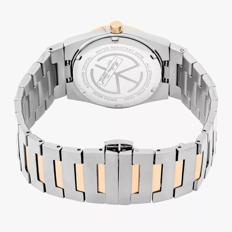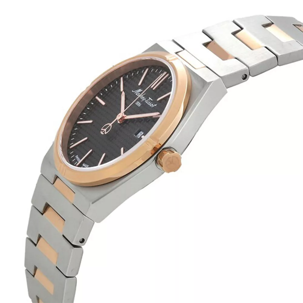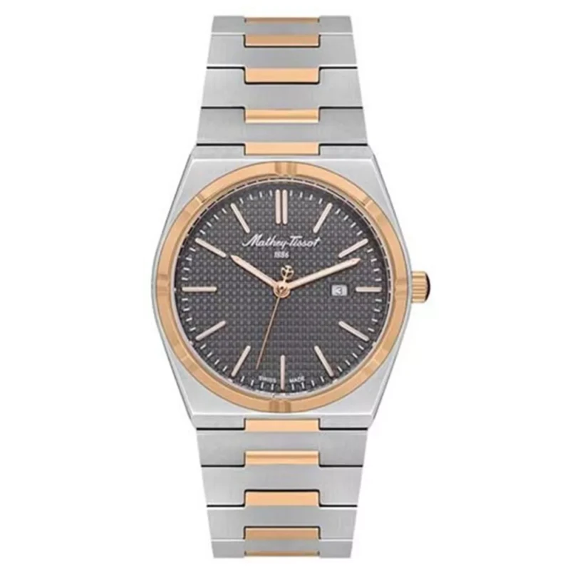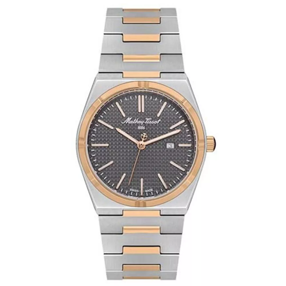 Mathey Tissot ženski sat iz kolekcije Zoltan. Kuc´ište i narukvica od nerđajućeg čelika u rose gold boji, sa fiksnim prstenom od nerđajućeg čelika u rose gold boji. Sivi brojčanik sa rose gold floroscentnim kazaljkama i indeksnim takođe florescentnim oznakama sati. Skala minuta oko unutrašnjeg ruba i prikaz datuma na poziciji od 3 sata.