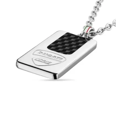 Muška ogrlica italijanskog brenda Ducati izrađena od čelika u srebrnoj boji sa priveskom na kojem se ističe logotip ovog brenda.