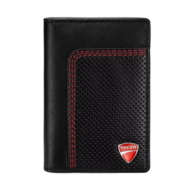 Crni kožni držač kartica bredna Ducati, dimenzija 11 cm X 8 cm. Više odeljaka za kartice omogućava uredno i lako dostupno čuvanje vaših najvažnijih stvari.