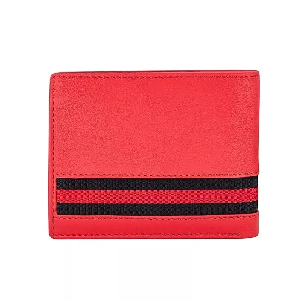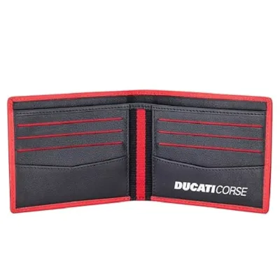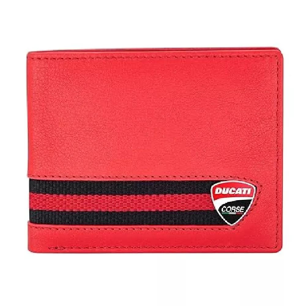 Kožni novčanik brenda Ducati u crvenoj boji, dimenzija 110 x 9 mm.