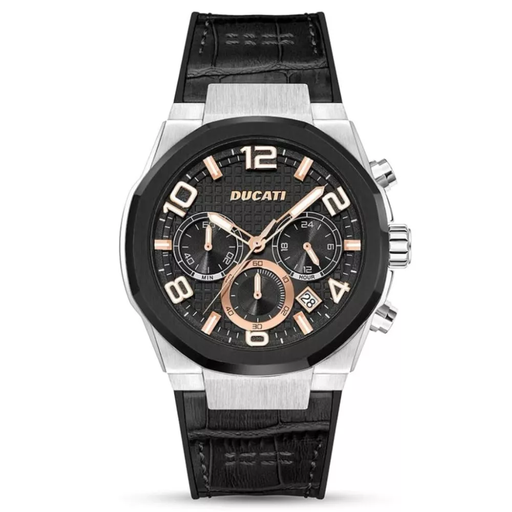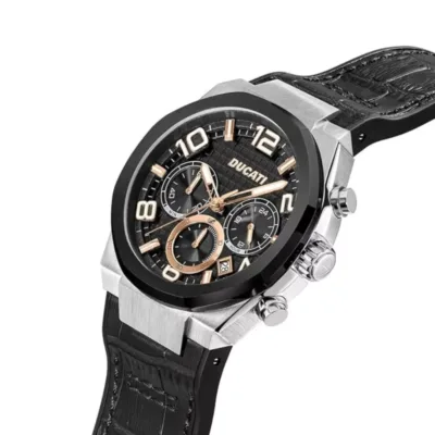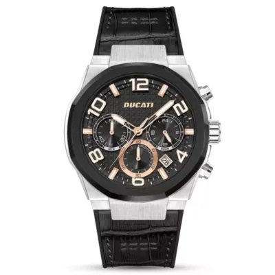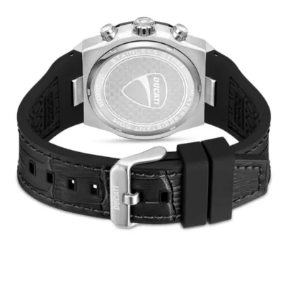 Osnažite svog unutrašnjeg šampiona uz Ducati hronograf sat, savršen spoj stila, performansi i izdržljivosti. Inspirisan duhom Ducati trka, ovaj sat donosi prepoznatljivi dizajn koji odiše smelošću i elegancijom. Sat sadrži okruglo kućište izrađeno od nerđajućeg čelika, prekriveno mineralnim staklom koje štiti crni analogni brojčanik sa bogatim detaljima i hrabrim akcentima. Kućište prečnika 43,5 mm i debljine 18 mm pruža snažan izgled, dok crni kožni kaiš širine 18 mm donosi udobnost i sofisticiranost. Pokretan kvarcnim mehanizmom, ovaj sat garantuje preciznost i pouzdanost. Vodootpornost do 50 metara čini ga pogodnim za povremeni kontakt s vodom, dok težina od 300 grama doprinosi njegovom robusnom osećaju.
