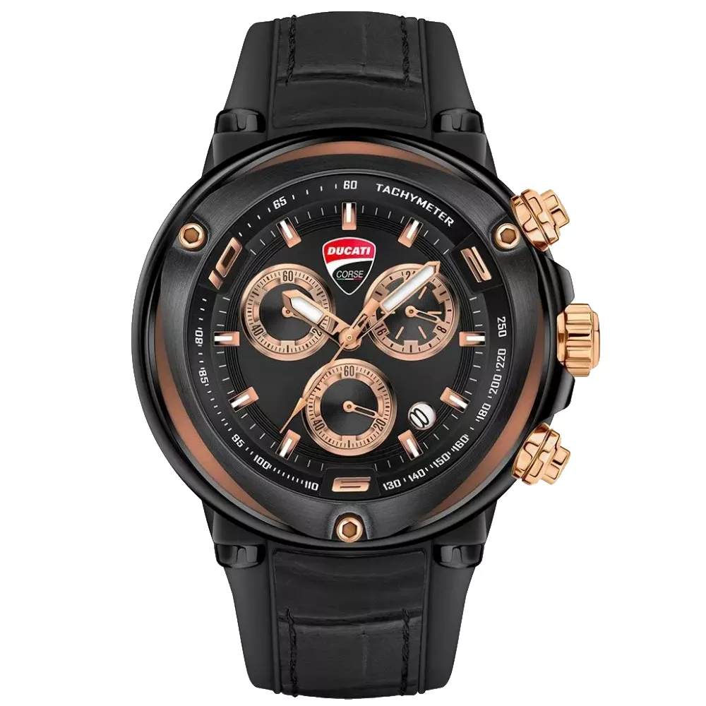 Spajajući savremeni stil sa performansama,ovaj muški analogni sat brenda Ducati pružiće vam moderan izgled. Crni brojčanik sa detaljima u boji roze zlata na kome se nalaze podbrojčanici određenih funkcija,zaštićen je mineralnim staklom i smešten u kućište od 49mm. Kaiš je od silikona crne boje koji naglašava izgled sata.