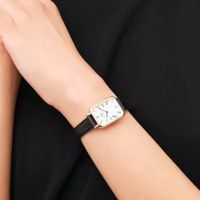 Sa detaljima inspirisanim vintage dizajnom – poput brojčanika sa rimskim brojevima i kazaljki od plavog čelika – ova verzija našeg Quadro sata u roze zlatu savršeno balansira između klasičnog i modernog. Dolazi sa zamenjivom crnom narukvicom od prave kože. Kućište dimenzija 20×26 mm