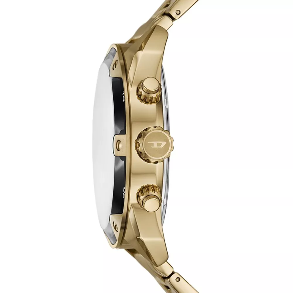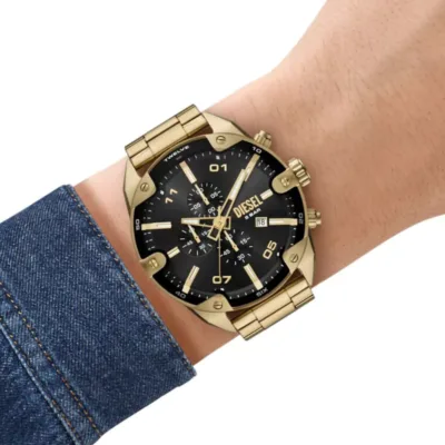 Diesel Spiked nosi deo urbanog stila direkt na tvom zglobu. Ovaj hronograf se izdvaja svojim upečatljivim dizajnom koji deluje istovremeno sportski i luksuzno. Kućište od nerđajućeg čelika i odgovarajući zlatni čelični kaiš daju satu elegantan, a u isto vreme i robustan izgled. Diesel Spiked ima upadljivo okruglo kućište prečnika 49 mm, što je čini savršenim izborom za veće ruke. Brojčanik, u crnoj boji, zaštićen je mineralnim staklom i ima karakteristične pomoćne brojčanike koji joj daju sportski, dinamičan karakter. Datum prikaz je tu da ti uvek budeš u toku sa datumom. Uz kvarcni mehanizam, ovaj sat pruža precizno merenje vremena, a sa vodootpornošću do 5 bara, pogodan je za aktivnosti pored jezera ili u bazenu. Falš kopča omogućava sigurno nošenje, dok zlatni čelični kaiš dodaje dašak luksuza. Bilo da je u pitanju svakodnevna upotreba ili posebne prilike – Diesel Spiked te pouzdano i stilizovano prati kroz svaki izazov.