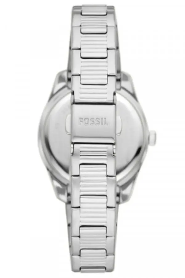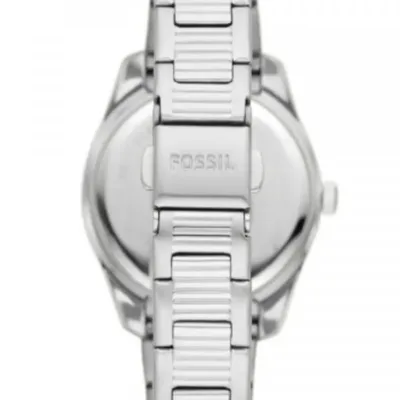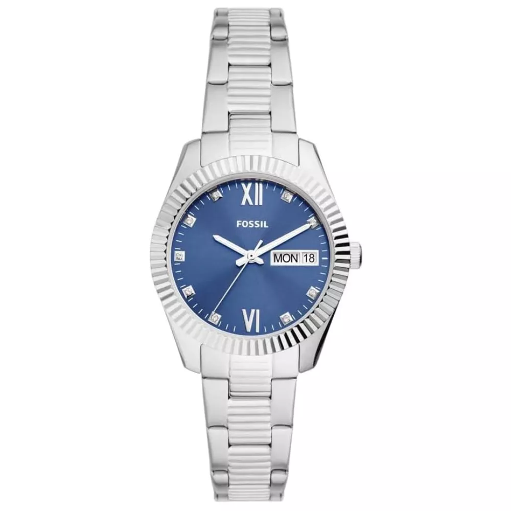 38mm Fossil Scarlette ženski sat sa plavim brojčanikom i srebrnom narukvicom od nerđajućeg čelika.