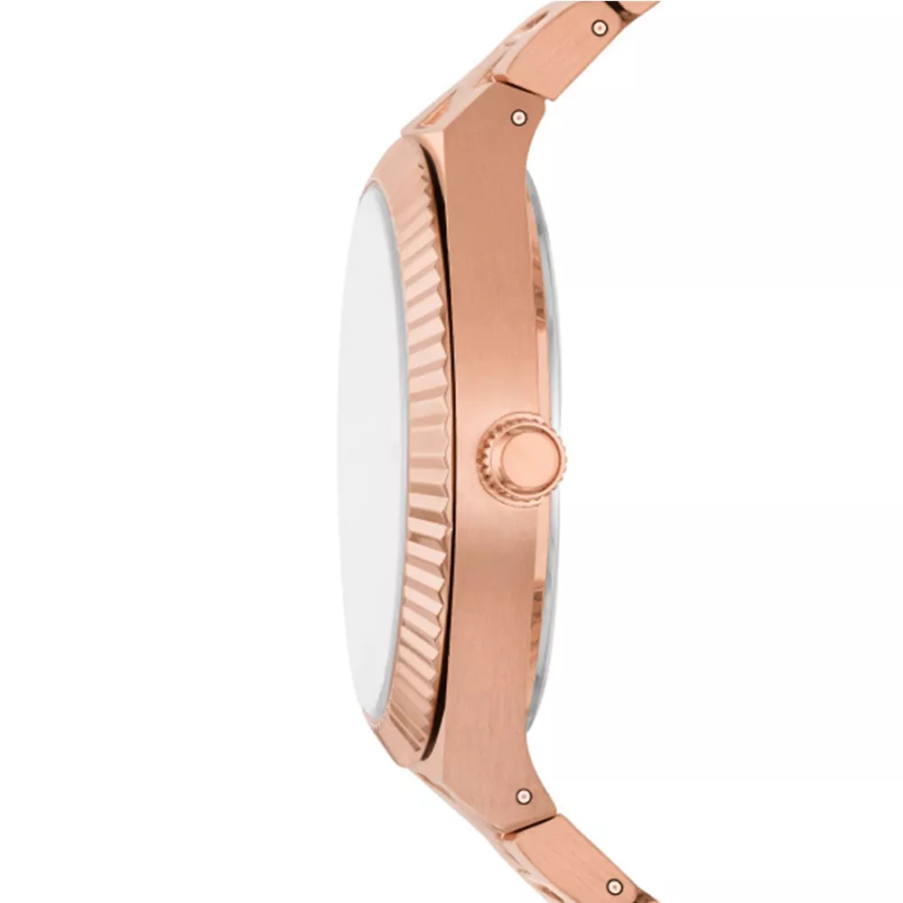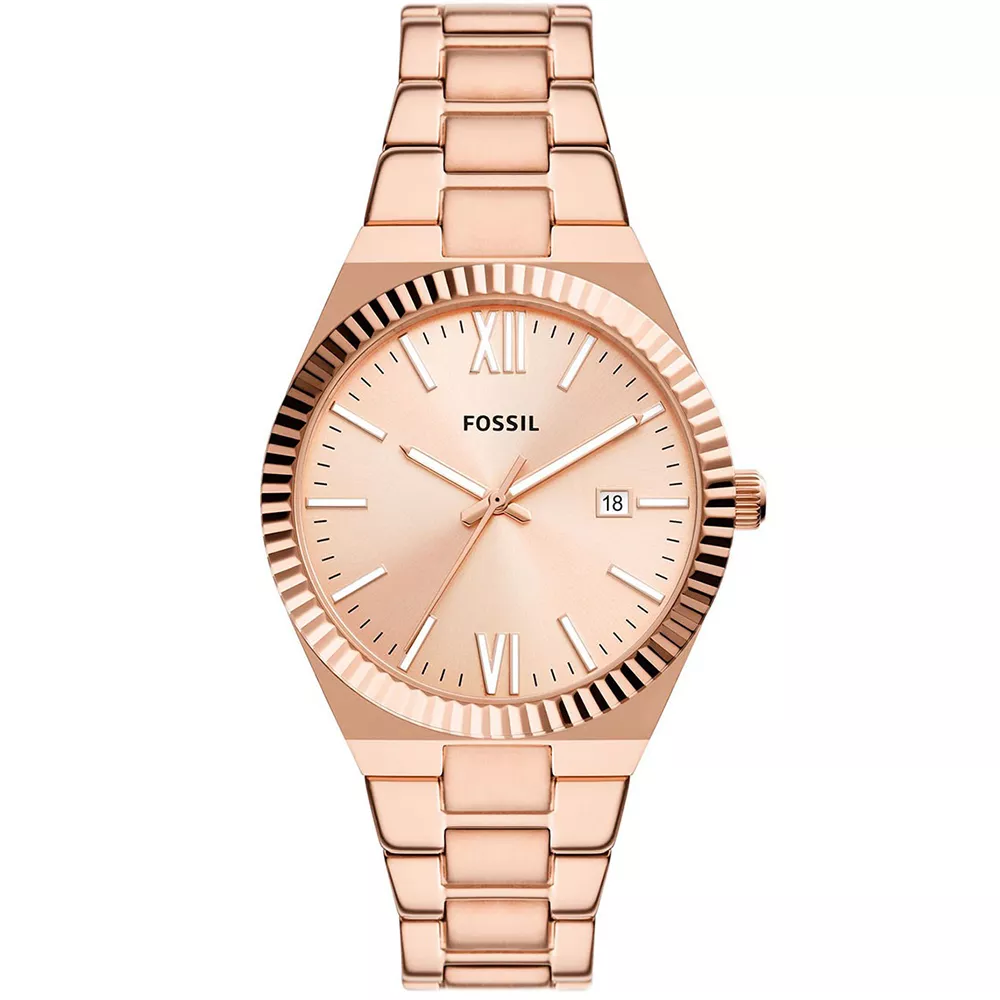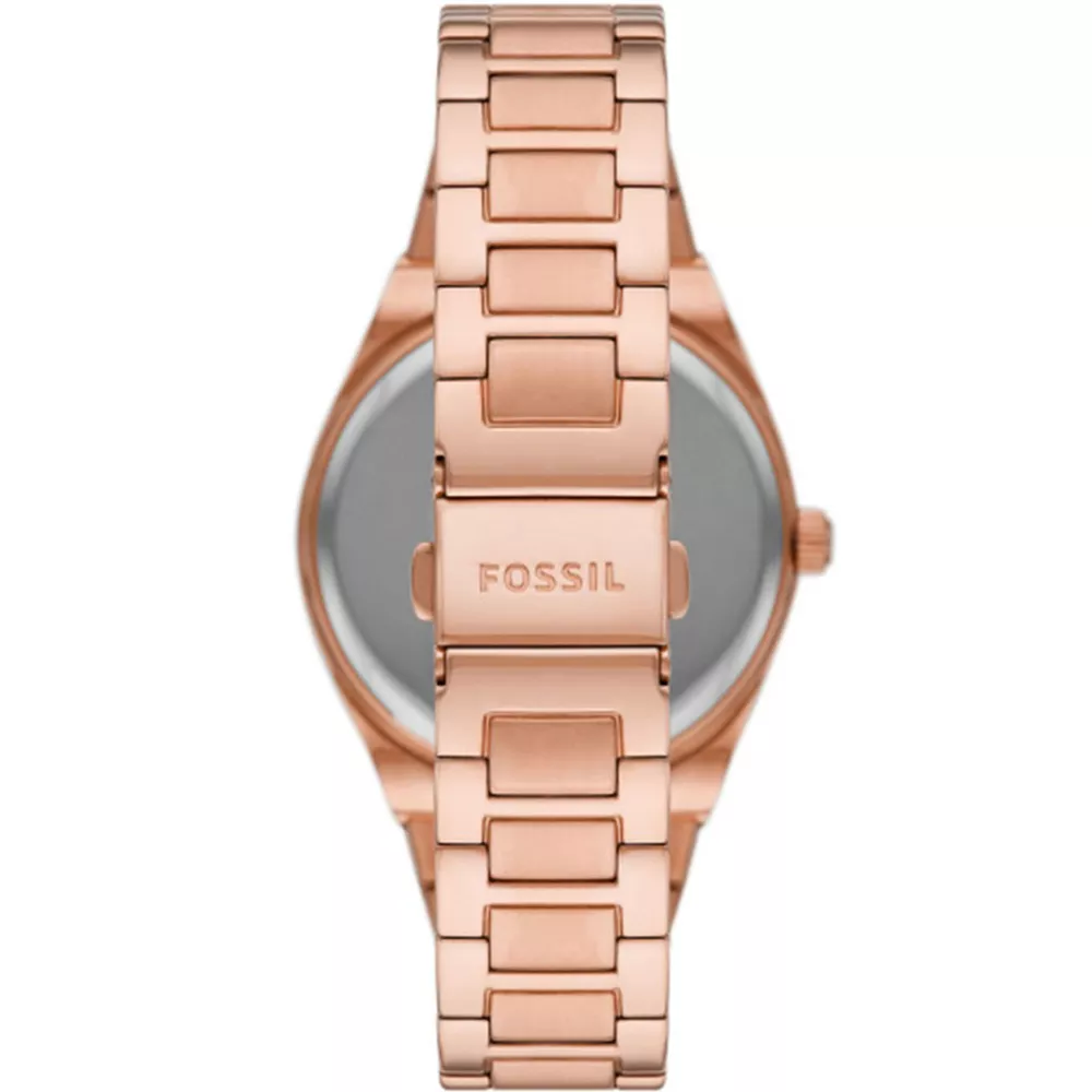 Ženski ručni sat bredna Fossil iz Scarlette kolekcije. Svedenog dizajna sa kućištem i narukvicom od nerđajućeg čelika u roze zlatnoj nijansi. Brojčanik sa prikazom datuma je roze zlatne boje, dok se indeksi i kazaljke lepo uklapaju sa svojom belom bojom.