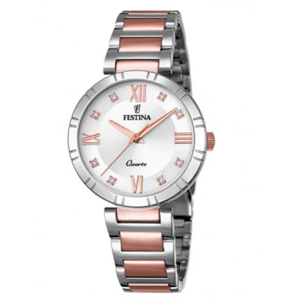Festina ženski sat sa srebrnim brojčanikom sa rimskim brojevima u boji roze zlata, cirkonima i narukvicom od nerđajućeg čelika u kombinaciji srebrne boje i roze zlata.