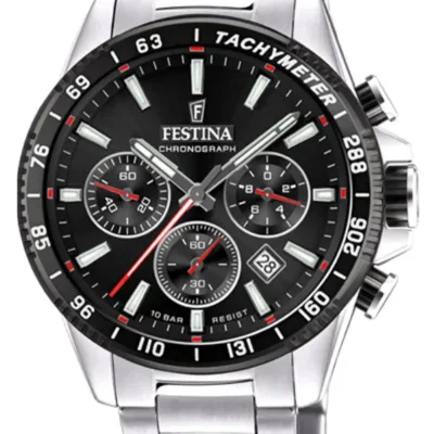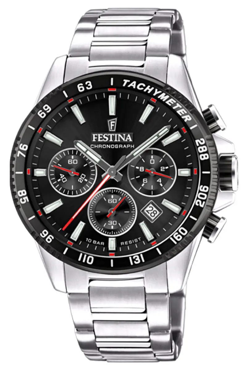 45mm Festina muški hronograf sat sa crnim brojčanikom, kućištem i narukvicom od nerđajućeg čelika srebrne boje.