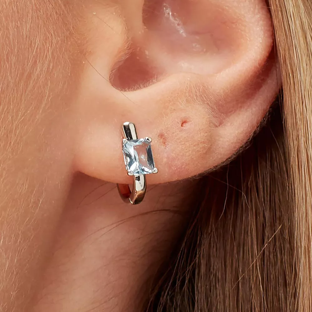 Jedna minđuša od srebra U oblika sa svetlo plavim baget cirkonom. Veličina: 12mm