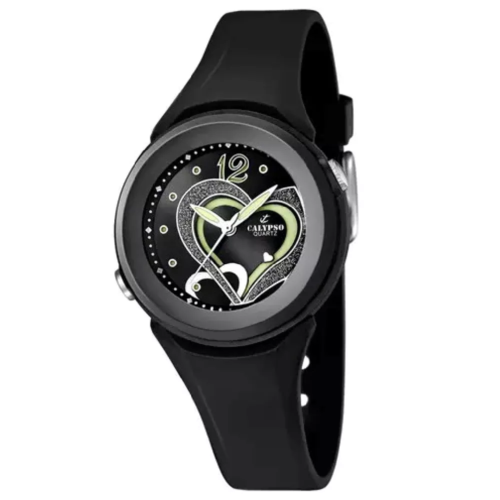Ženski sat brenda Calypso sa zanimljivim dizajnom brojčanika i motivom srca.Sat ima crnu silikonsku narukvicu.