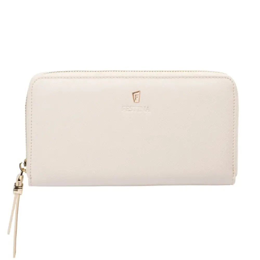 Elegantan ženski novčanik napravljen od kože, prelepe strukture. Ova bež verzija ima kontrastnu unutrašnjost braon boje. Svaki novčanik je završen fino reljefnim Festina potpisom.