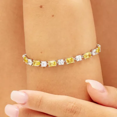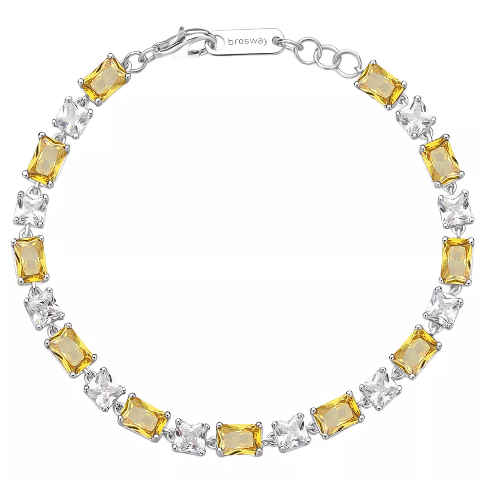 Brosway Fancy narukvica od rodinisanog srebra, ukrašena prozirnim jastučićasto sečenim (cushion cut) kubnim cirkonima i baguette cirkonima u zlatno-žutoj boji. Spoj klasične elegancije i modernog dizajna čini ovu narukvicu idealnim izborom za svečane prilike, ali i za svakodnevnu sofisticiranu notu.