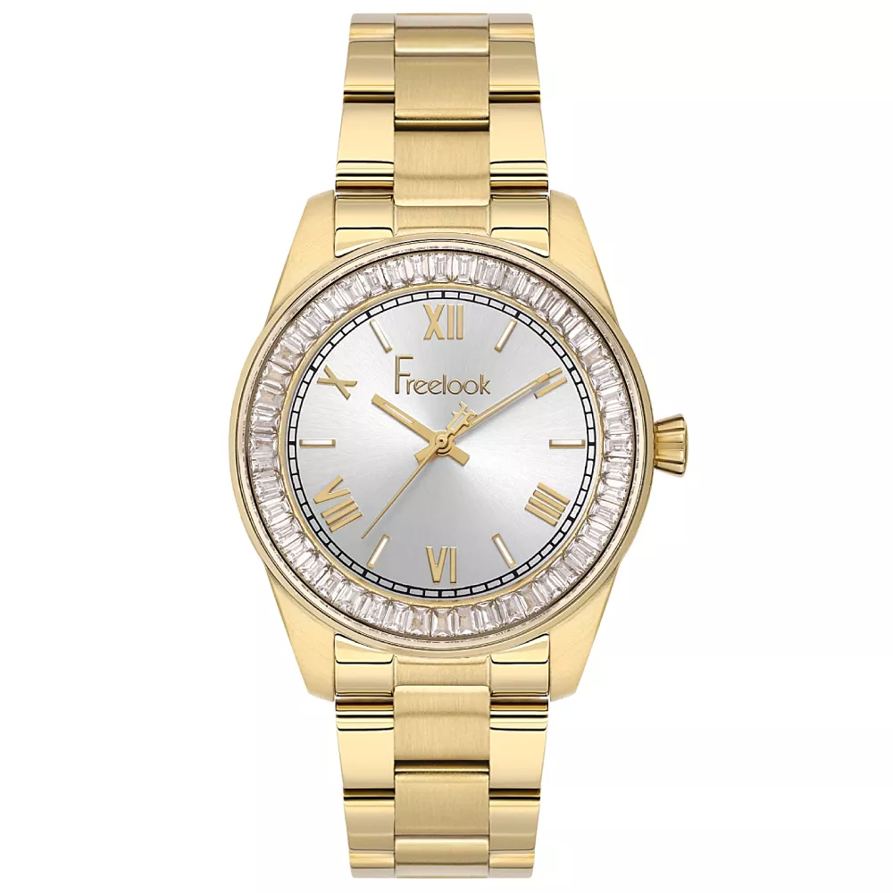 Elegantni ženski sat Freelook iz kolekcije Charmant odiše klasičnom sofisticiranošću i nežnim dizajnom. Izrađen od nerđajućeg čelika sa zlatnim premazom, ovaj model ima kućište prečnika 36 mm, ukrašeno prstenom sa finim kristalima. Srebrni brojčanik sa zlatnim detaljima i luminescentnim kazaljkama omogućava lako očitavanje vremena, čak i u mraku. Sat pokreće precizan kvarcni mehanizam, dok mineralno staklo pruža dodatnu otpornost. Vodootpornost od 5 ATM dozvoljava povremeni kontakt s vodom, kao što je pranje ruku.
