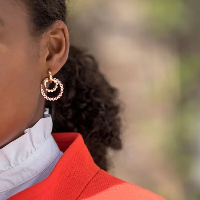 Okrugli privezak u srebrnoj boji sa kristalima u crvenim tonovima, holandskog brenda MelanO Colors se može prilagoditi vašem raspoloženju ili trenutnoj odevnoj kombinaciji kombinovanjem sa osnovama za minđuše u obliku alki, ili jednostavnim kačenjem na lančić. Prečnik priveska je 15mm.