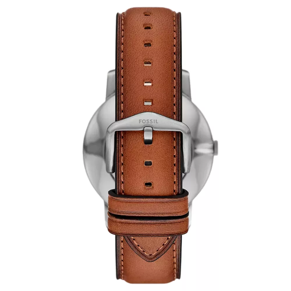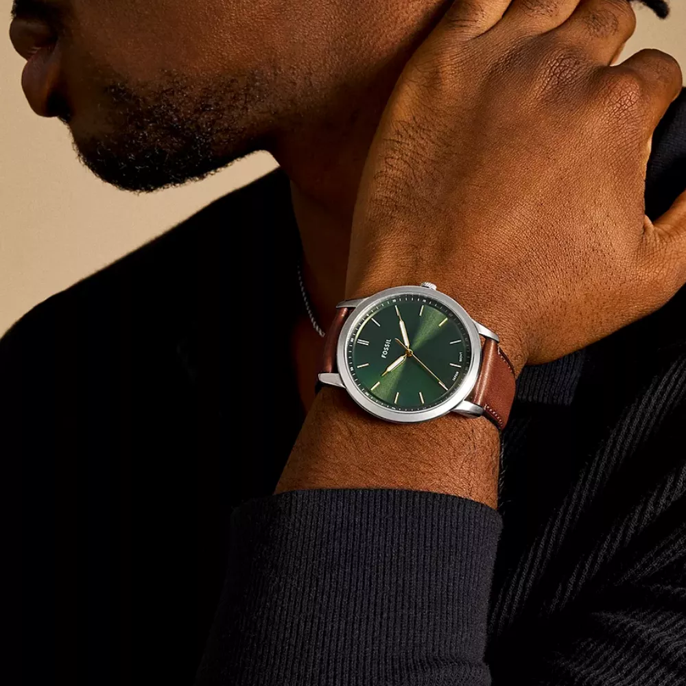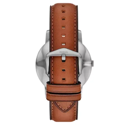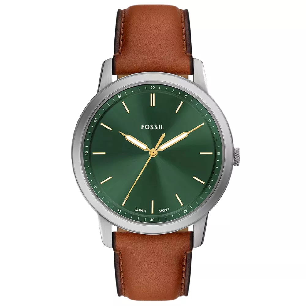 Fossil muški sat sa kvarcnim mehanizmom odiše klasičnim stilom i elegancijom. Kućište okruglog oblika prečnika 44 mm i debljine 7 mm izrađeno je od nerđajućeg čelika sa poliranom i satenskom završnicom u srebrnoj boji. Zeleni brojčanik prekriven je transparentnim staklom, dok kaiš od visokokvalitetne smeđe kože dolazi sa klasičnom kopčom na iglicu. Udaljenost između lugova je 22 mm. Vodootpornost od 5 ATM omogućava otpornost na prskanje vode i kišu, čineći ga idealnim za svakodnevnu upotrebu.
