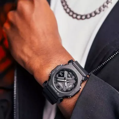 Casio G-Shock GA 2300-1A je novi dodatak Casio liniji izdržljivih G-Shock satova. Motiv “X” na brojčaniku sata podseća na stariju seriju GA-120, dok oblik kućišta može upućivati ??na oktagonalna kućišta serije GA-2100 i GA-B001. Sat ima kombinovani brojčanik koji prikazuje datum, dan u nedelji, štopericu, alarm i druge funkcije koje možete koristiti za sport i slobodno vreme. Kalendar sata je potpuno automatski. Kućište sata od resina nadopunjeno je gumenom narukvicom izvrsnim za visoku izdržljivost i dug vek trajanja. Brojčanik je zaštićen mineralnim staklom. Za laku čitljivost u slabom osvetljenju, sat je opremljen kazaljkama obloženim luminiscentnim premazom i dvostrukim LED osvjetljenjem koje osvetljava i analogni dio i digitalni ekran kada se pritisne tipka.Dodatni brojčanik koji pokazuje trenutni dan nalazi se na poziciji 9 sati, dok digitalni monitori prikazuju ne samo odabrani način rada već i povezane podatke. Prečnik kućišta od 42,1 mm čini ga satom srednje veličine. Vodootpornost ovog modela je 200 m, tako da možete bez problema plivati ??sa satom. Serija modela Casio G-Shock nudi prikladan sat za svakoga tko traži kombinaciju izdržljivog, sportskog sata atraktivnog dizajna, u kombinaciji s bogatim rasponom funkcija. Svi modeli u ovoj globalno popularnoj ponudi otporniji su na udarce, takođe pokazuju povećanu otpornost na magnetnaa polja.