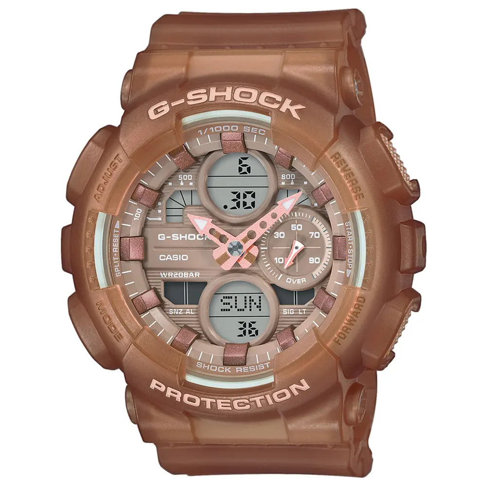 Modeli iz G-Shock kolekcije su izuzetno jaki i otporni kako na udarce tako i na vibracije i vodu. Zbog svoje čvrste konstrukcije i mnogobrojnih funkcija odgovaraju širokom rasponu sportskih stilova. Braon transparentna boja kućišta i narukvice u kombinaciji sa detaljima na displeju čini ovaj model savršenim pratiocem pravih avanturista.