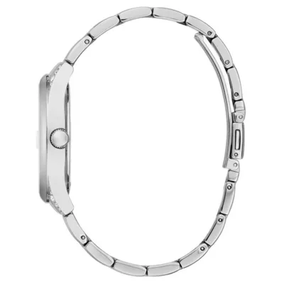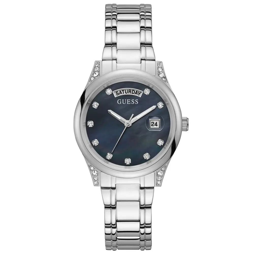 Ženski ručni sat brenda Guess iz kolekcije Aura. Ovaj model se ističe svojim prefinjenim dizajnom. Brojčanik je plav sa istaknutim cirkonima. Narukvica je srebrne boje i izrađena je od nerđajućeg čelika.