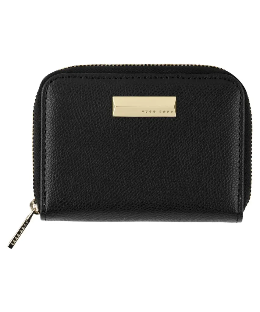 Hugo Boss futrola crne boje sa zlatnom pločicom na kojoj je izgraviran logo.