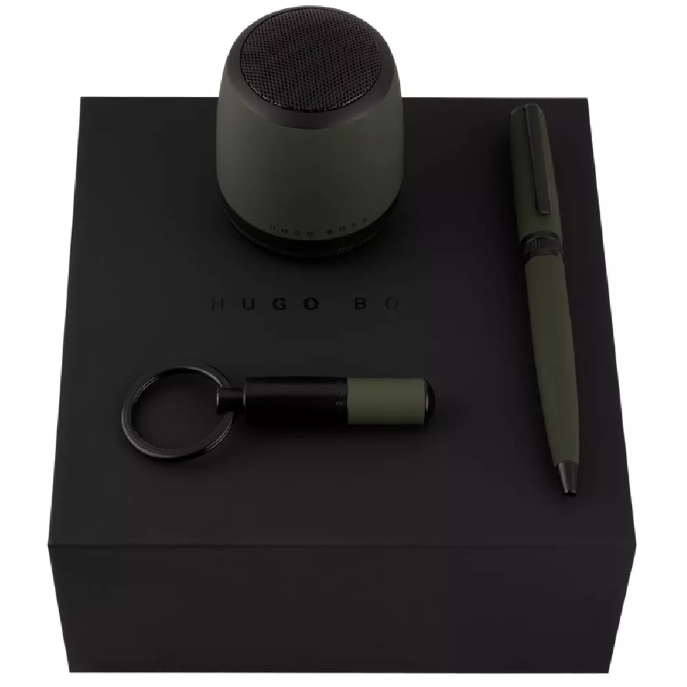Ovaj Hugo Boss set se sastoji od WIFI zvučnika, privezka za ključeve i hemijske olovke. Ultra lagan i hiperfunkcionalan, zvučnik iz kolekcije Hugo Boss Gear Matrik je nezaobilazan dodatak za vaš svakodnevni život. Bez obzira da li ste kod kuc´e, u kancelariji, na putu ili na odmoru, ne možete da živite bez toga. Sa svojom tehnologijom bežičnog povezivanja, uparite bilo koji mobilni uređaj i slušajte svoju omiljenu muziku ili radio, uzmite poziv i obavljajte konferencijske pozive sa lakoc´om bez potrebe da koristite mobilni telefon. Gear Matrik privezak za ključeve dolazi u obliku cevi, mat crnih metalnih umetaka sa fino ugraviranim HUGO BOSS potpisom. Savršeno izbalansirano cev „Gear Matrik” hemijske olovke odlikuje se svetlim, kontrastnim bojama dajuc´i joj energičan, moderan izgled koji je jedinstven za brend HUGO BOSS.